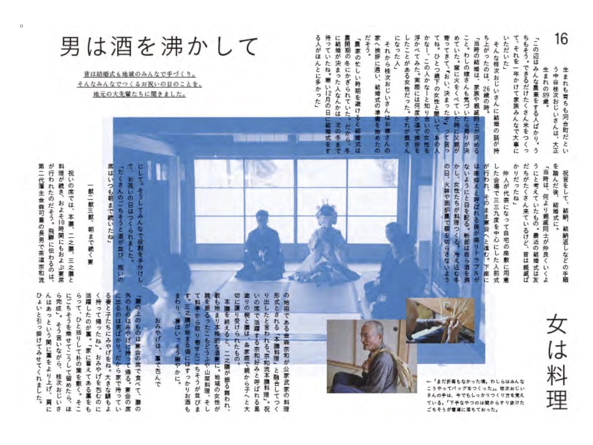 そこには、飛騨は農家が多かったので結婚式はみんなが少しゆっくりと暮らせる農閑期の冬に行われていたことや、宴会には家長である男性しか出られず、残ったご馳走は妻と子どものために藁で編んだ袋を肩に引っ掛けて持ち帰っていたことなど、その土地ならではの独特な文化が描かれています。