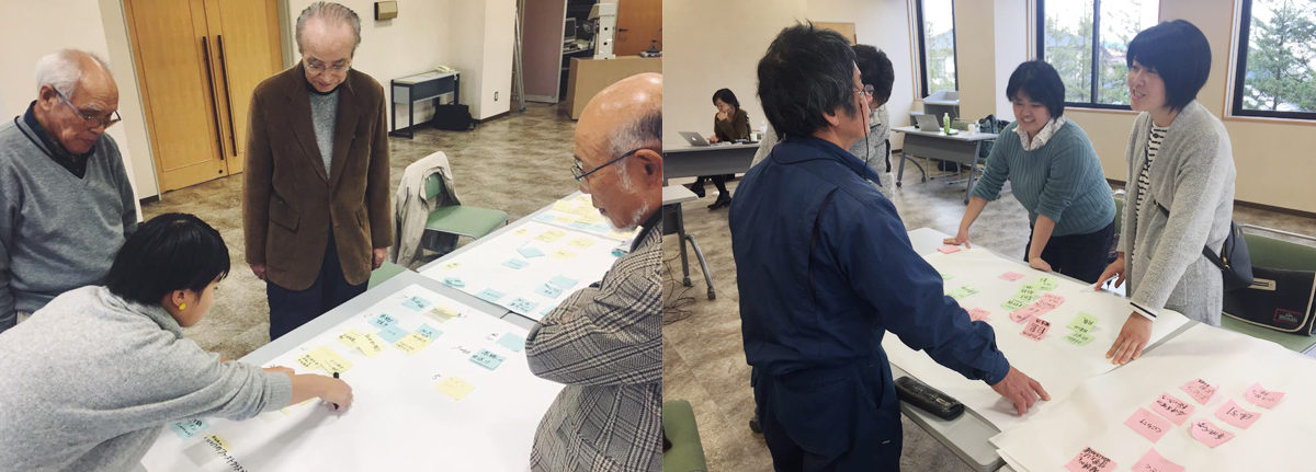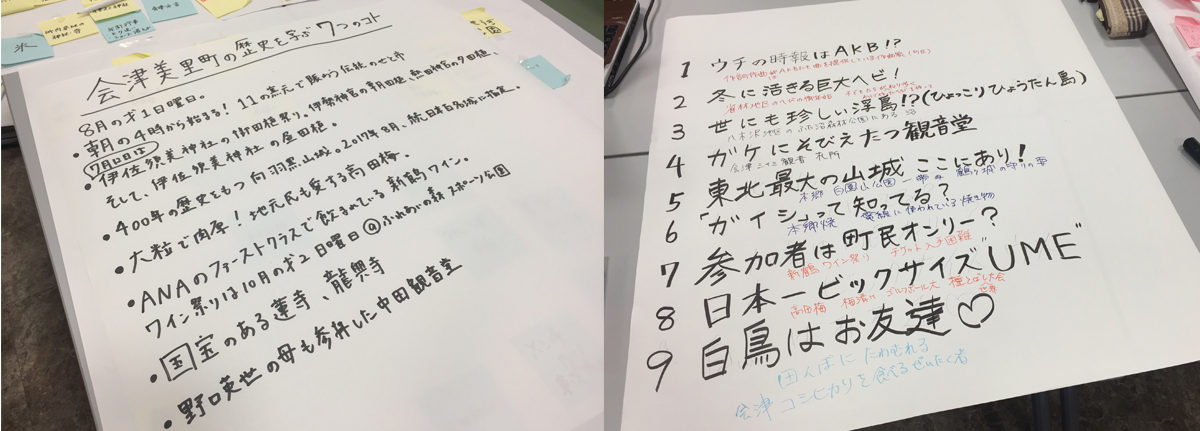 後半はいよいよ実践へ。第1回のワークショップで参加者が書き出した「会津美里で伝えたいもの」のなかから、「特に伝えたいと思うもの」をみんなで選び出します。