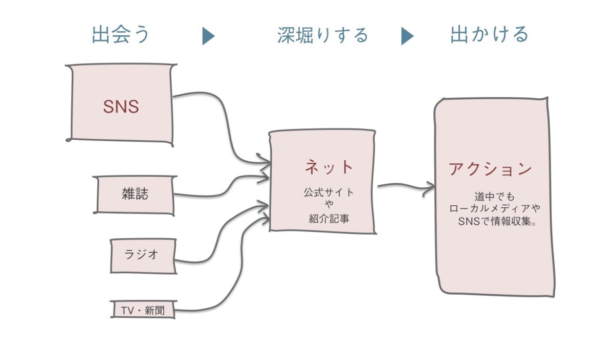 「都心で働いている」「旅好き」「ローカルの文化に関心がある」という30代前半の女性40名を対象に柿原が行なったアンケート調査の結果によると、ほとんどの方が「まずはSNSをチェックする」と答えたのだとか。