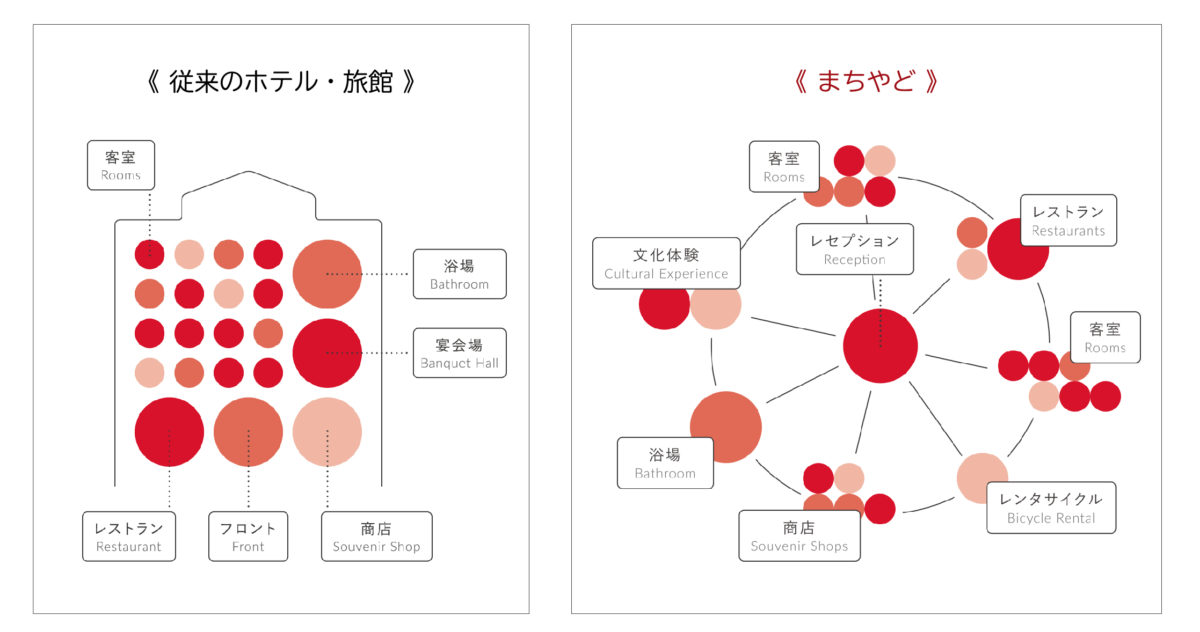 「まちやど」は、宿(宿泊施設)を指すわけではありません。「まち」をひとつの宿と見立て、宿泊施設と地域の日常をネットワークさせ、まちぐるみで訪れる人々をもてなすことで地域の価値を高め、地域内経済の循環を目指す事業です。