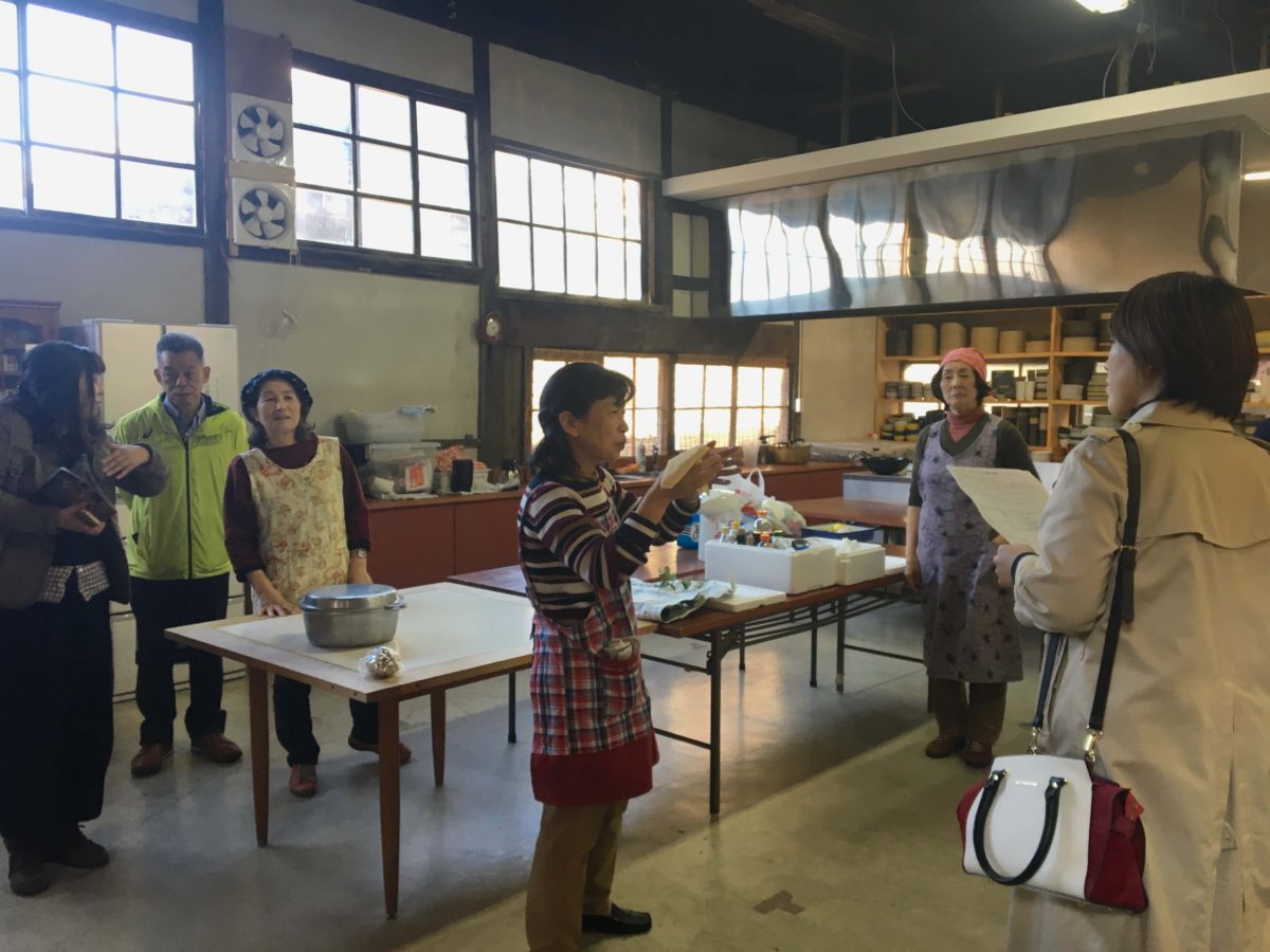 波佐見の郷土料理「なすび飯」「田作り」「ざぼん漬」などを教えるワークショップに、小林常務(左奥、黄色いアウターの男性)とともに。