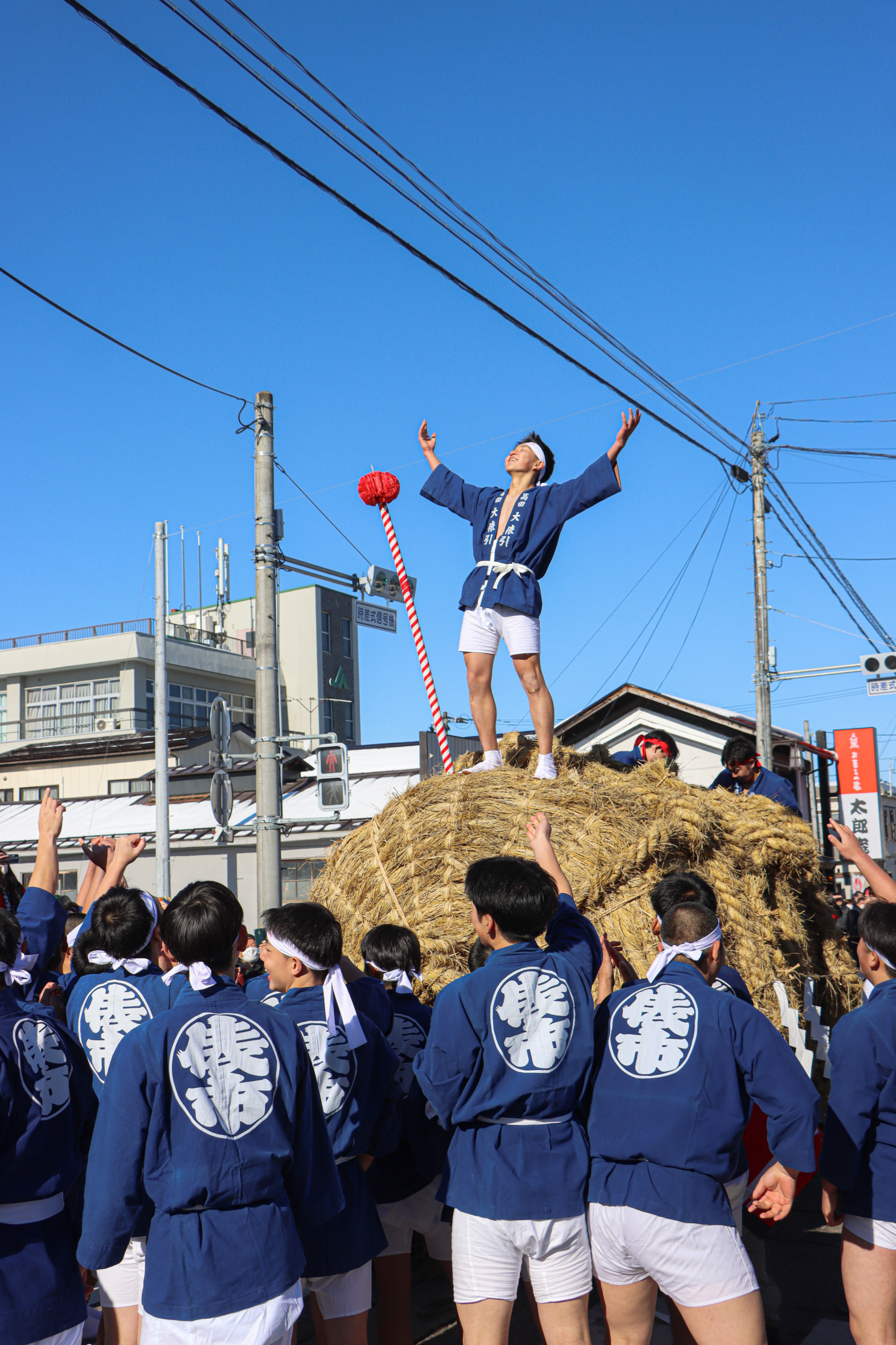 観光協会長賞の作品では、町の奇祭、大俵引きにおいて、御守銭棒を見事に奪い取った青年の晴れ姿が捉えられています。